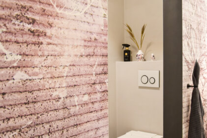 Rosa küsst hellblau. Dem sanften Hellblau steht eine blumige rosa Wand nebenan. Das Farbspiel ist von dunklen Akzenten unterstrichen und bietet damit